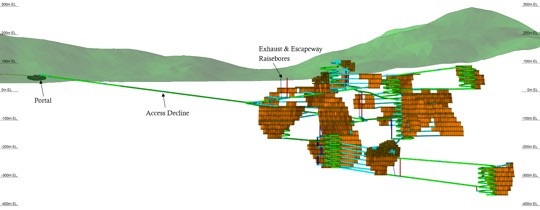 The mine will be accessed via a 900m decline initiated from a surface portal. No shaft sinking is necessary. Ventilation and secondary escapeway will be achieved via raisebore to surface. Haulage ramps will be progressively developed to access all mining areas within the various resource veins. Mine development is assumed to be undertaken by a contractor and will incorporate cover drilling and pressure grouting on advance to control potential water inflows. None of the underground workings lie beneath the Herbert Glacier.