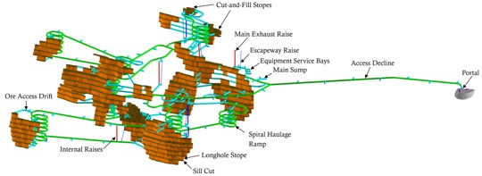 The image below shows a 3-D view of the underground mine when all development and production activities are complete.
